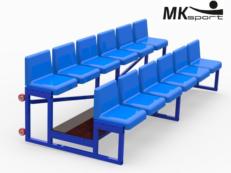 Трибуна для зрителей мобильная двухрядная на 12 мест с колесами. Металлокаркас трибуны изготовлен из профильной трубы 40*40*2мм и 40*25*2мм. Материал покрытия пола – влагостойкая ламинированная фанера 9мм с антискользящим покрытием. Сидения пластиковые. Покраска полимерная порошковая с предварительной покраской цинкосодержащим грунтом, цвет синий. Возможны модификации на 6, 8 и 10 мест.