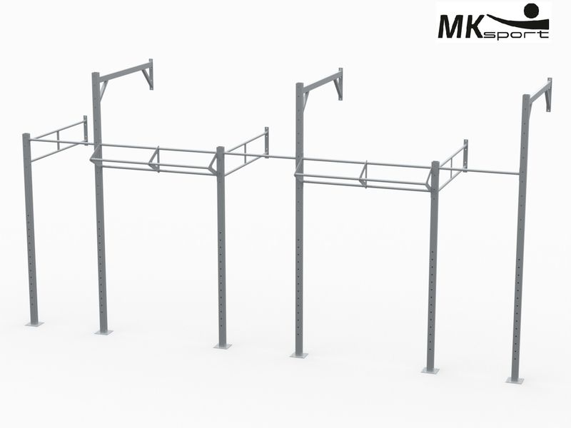 Большой тренировочный кроссфит комплекс пригоден для установки в спортивных залах и на уличных площадках, подходит для тренировки целой группы спортсменов. Комплекс включает несколько рабочих зон: для работы со штангой, упражнений в висе, подтягиваний, гимнастики, подвешивания дополнительных снарядов (колец, груши, каната). Шесть опор, изготовленных из толстостенной стали, обеспечивают прочность конструкции. Усиленные перекладины придают дополнительную жесткость, повышают устойчивость к большим нагрузкам.